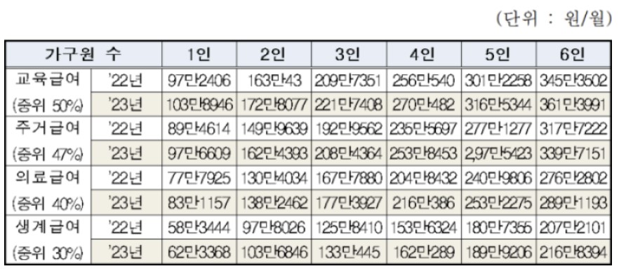 | 가구원수 | 2023년 기준중위소득 | 기분중위소득 50% |